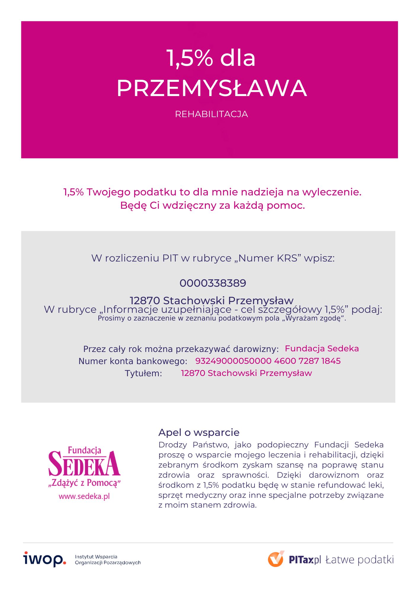 Przemysław jest podopiecznym Fundacji Sedeka, za pośrednictwem której prowadzone jest zbieranie środków na leczenie i rehabilitację. Zgromadzone fundusze zostaną przeznaczone m.in. na: