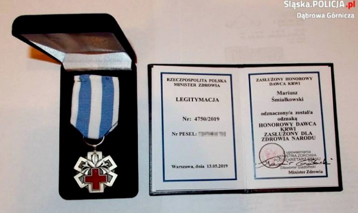 Mariusz Śmiałkowski – wiceprzewodniczący ZW NSZZ Policjantów woj. śląskiego otrzymał odznaczenie „Honorowy Dawca Krwi – Zasłużony dla Zdrowia Narodu”