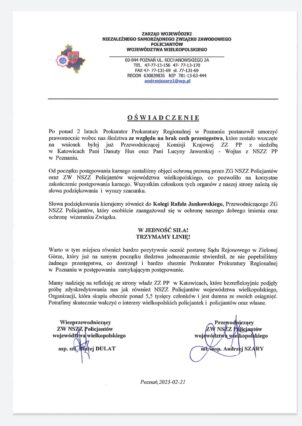Oświadczenie ZW NSZZ Policjantów woj. wielkopolskiego