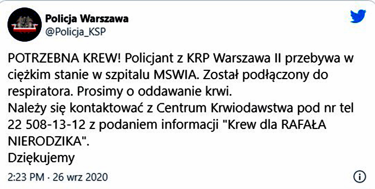 Policjant z Mokotowa został zakażony koronawirusem. Jest w ciężkim stanie. Potrzebna krew.