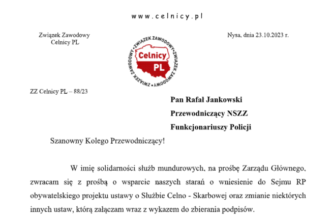 Prośba o wsparcie od ZZ Celnicy PL