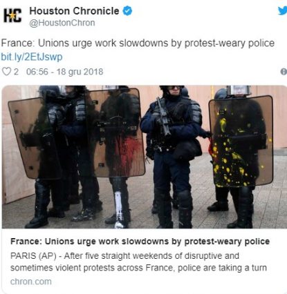 Związki zawodowe policjantów we Francji wystąpiły w poniedziałek o rekompensaty za miesiąc mobilizacji w związku z protestami „żółtych kamizelek”.
