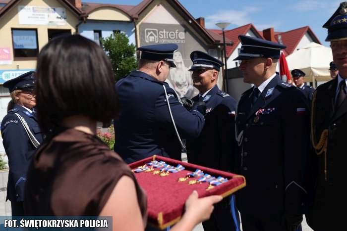 Po wręczeniu medali nadszedł moment na okolicznościowe przemówienia, w których fukcjonariusze usłyszeli wiele słów uznania, gratulacji i podziękowań za dotychczasową służbę. W swoim wystąpieniu Zastępca Komendanta Wojewódzkiego Policji w Kielcach insp. Jacek Cholewa, podziękował wszystkim policjantom i pracownikom cywilnym za ich służbę i pracę podkreślając, że służba w Policji to coś więcej niż zawód – to misja, która wymaga niezwykłego poświęcenia, odwagi i zaangażowania. Życzył im dalszych sukcesów w służbie, jednocześnie zachęcając do nieustannego rozwoju i doskonalenia.