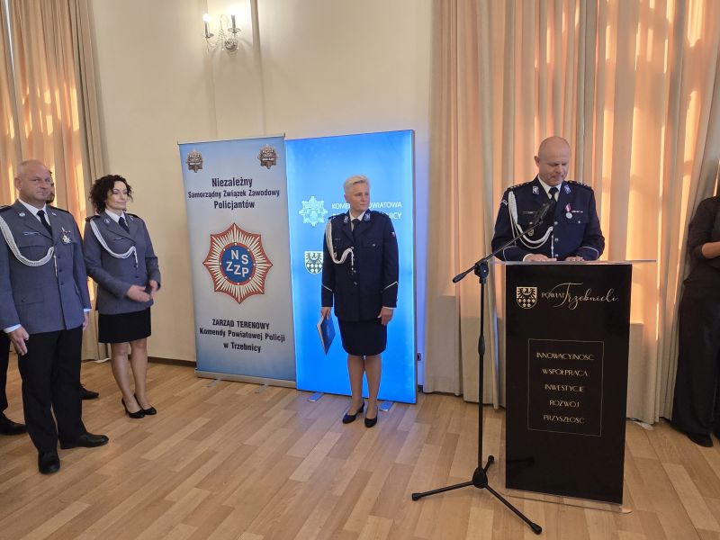 Na zakończenie głos zabrał I Zastępca Komendanta Wojewódzkiego Policji we Wrocławiu inspektor Norbert Kurenda, który odczytał list od komendanta Wojewódzkiego Policji we Wrocławiu nadinspektora Pawła Półtorzyckiego. Następnie skierował słowa uznania i wdzięczności dla policjantów za ofiarną służbę, profesjonalizm i ogromny wkład w poczucie bezpieczeństwa mieszkańców powiatu trzebnickiego. Gratulował awansów, nagród i wyróżnień oraz przekazał życzenia dla rodzin funkcjonariuszy. Życzył satysfakcji z dalszej pracy zawodowej oraz wszelkiej pomyślności w życiu osobistym. Podziękował również przedstawicielom podmiotów wspierających pracę naszych policjantów, dzięki którym możliwe jest realizowanie wielu inicjatyw. Podkreślił także znaczenie obecności kobiet w służbie, dziękując im za zaangażowanie i profesjonalizm.